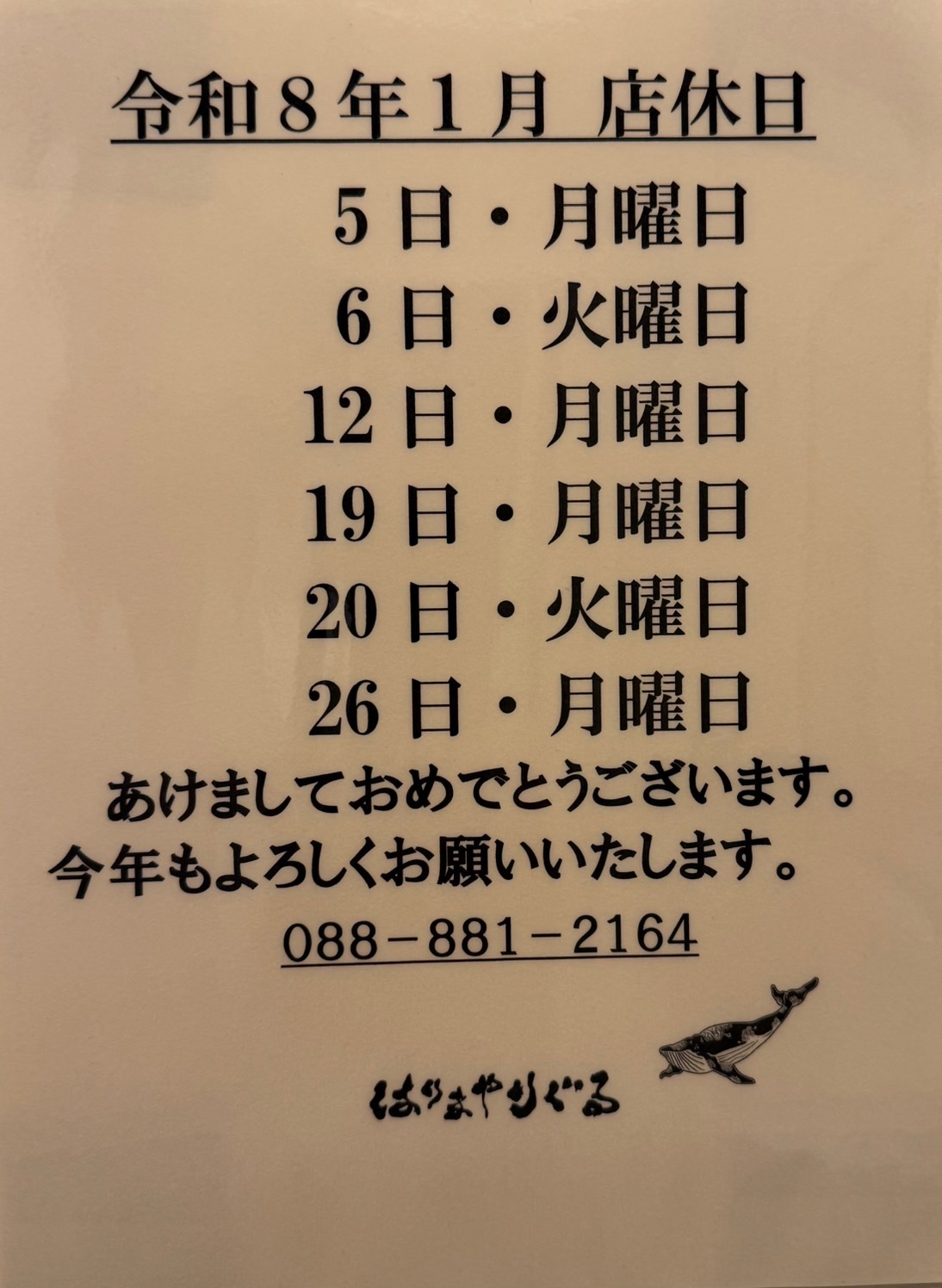 1月の店休日のお知らせです。