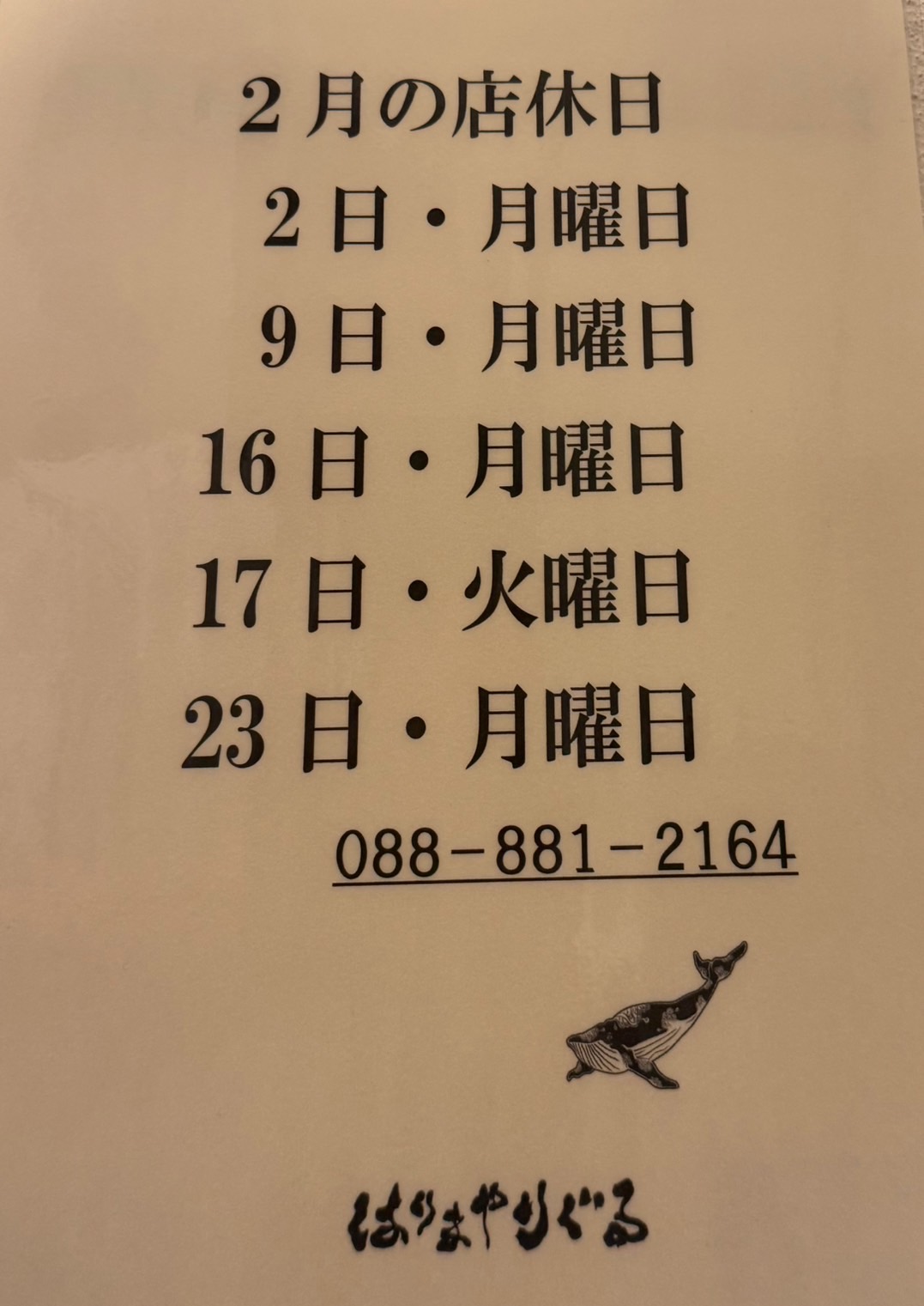 2月の店休日のお知らせです。